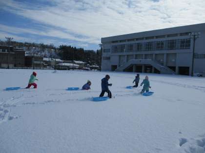 たくさん雪が積もり大喜びの子供たち。「グラウンドの築山で、そり滑りをしよう」と元気にそりを引いて歩き出しました。グラウンドの雪は思ったより深く昨日は「足が抜けなくなった」「前に進めない」と苦戦していましたが、今日は昨日の道ができていたのであっという間に築山に到着できました。
