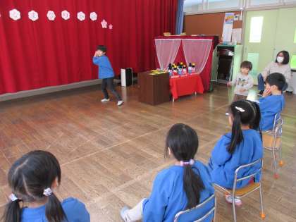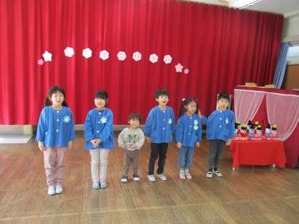わくわくルームに自分たちでつくったひな人形を飾り、親子サークルの友達と一緒にひなまつり会をしました。園長先生から由来のお話を聞いたり、みんなで歌を歌ったり、自分でつくったひな人形を紹介したりしました。