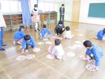 ゲームコーナーでは『おひなさまオセロ』をしました。お内裏様チームとお雛様チームに分かれ、カードをめくっていくゲームです。自分のチームのカードがたくさんになるよう頑張っていました。2回戦行い、結果は仲良く引き分けでした。