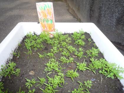 玄関先にひっそりとそしてみずみずしく育っている人参君たち。