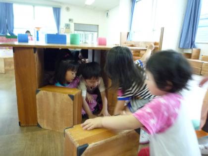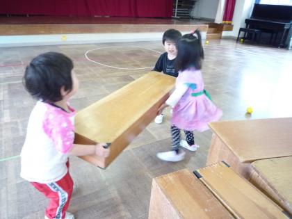 大きな積み木を、お友達と一緒に運んでさあ出来上がり。