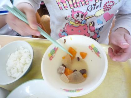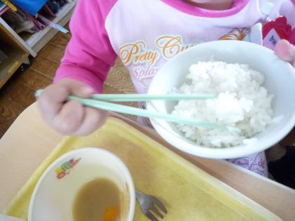 始めはなかなかうまく持てませんが、中には正しくお箸を持てるお友達もいました。
