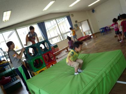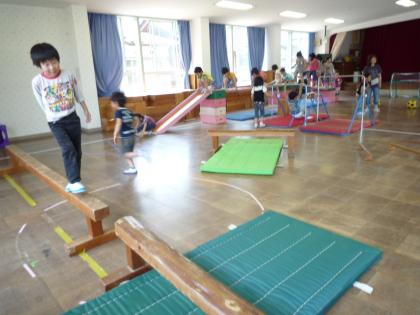 「何がおもしろかったん」「あのね、すごいことして遊んだん」「じゃ教えて」「いいよ」と早速マットや鉄棒を使ってアスレチックを作り出す年長児さん。