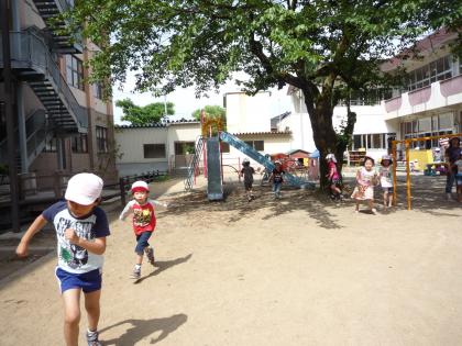 「忍者ごっこしよう」と友達を誘って、幼稚園の園庭を忍者のように早く走ったり、岩から岩へと飛び移ったり、高い鎖の塀を登ったりしていた子どもたち。