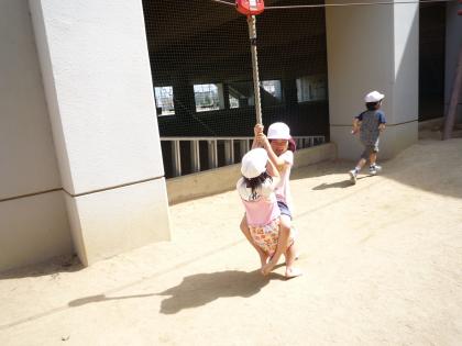 「先生見て」と二人でターザンロープを見せてくれたお友達。始めはなかなか気が合わずに失敗ばかり。それでも、何回か繰り返す間に気持ちが合い、こんなにかっこよく二人で抱き合ってクリアーできました。