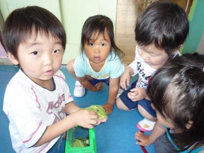 ちょうどその日、ほんもののあおむし君がお散歩にやってきました。