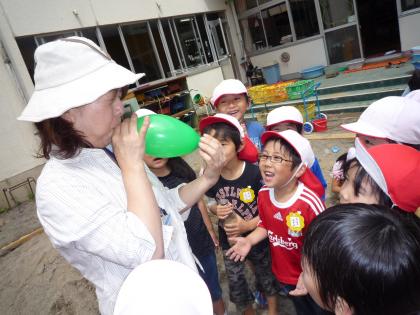 その一つにふうせんを膨らます修行がありました。おかしらも家来も挑戦しましたが・・・そこで先生に・・・さすが先生!!!忍者たちの前で見事にふうせんを膨らますことができました。子どもたちから自然に拍手がおこりました。めでたしめでたし。
