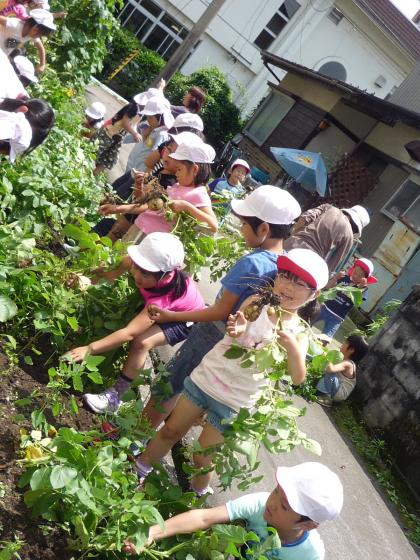 5歳児さんが遊戯室の横にある畑で、じゃがいもを掘りました。