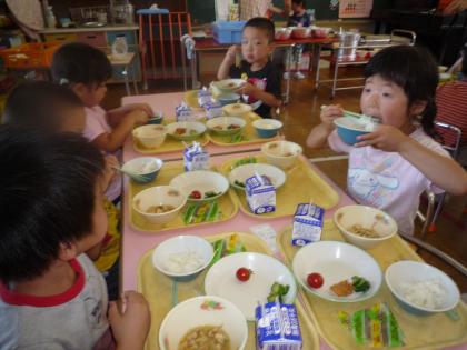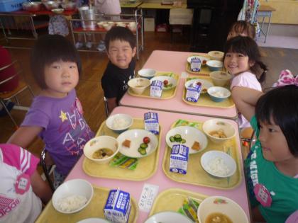 4歳児さんは、自分たちで配膳し、静かに食事をすることができるようになりました。
