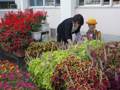 「お花きれいに咲いているね」「お花畑みたいだね」とお母さんと会話しながら、お水をあげているお友達。