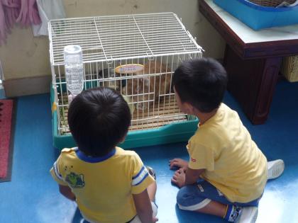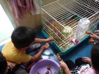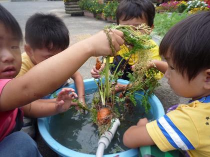 「あれ、丸い人参だね」(実は発育不良)といいながら、人参を掘り出し、砂を落とし、ふわふわ君にあげていました。