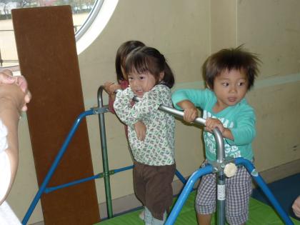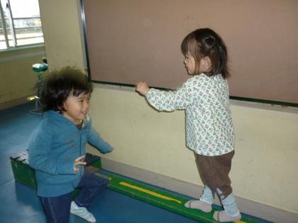 2階の廊下では、早速鉄棒や平均台で遊ぶ姿が見られました。
