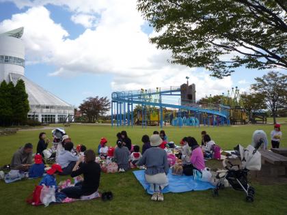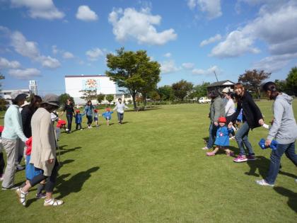 広場では、おうちの人と一緒にフォークダンスを一緒にしたり、花いちもんめのゲームをしたりして楽しく交流した後、大きな遊具で遊びました。