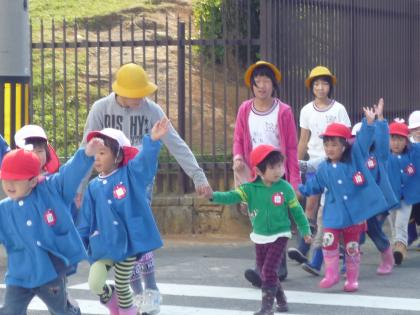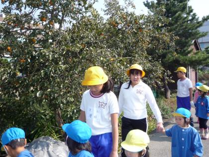 横断歩道では「ほら、車が来るよ。右見て左見て、手を上げて渡るんだよ」と教えたり、途中で、柿が成っていると「熊が柿を食べに出てくるんだよ。でもね、熊って怖がりなんだよ」と教えてくれたりしていました。
