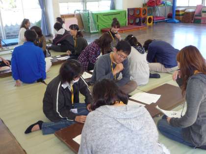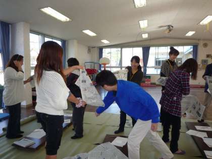 はじめは緊張していたお母さんたちも、生年月日順のグループ決めから少しずつ表情が柔らかくなり、最後のストレス解消法の一つである新聞パンチでは、笑顔や笑い声が聞こえてくるまでになりました。