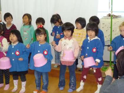 3歳児さんも仲間入り。お礼に手作り楽器の合奏を披露しました。