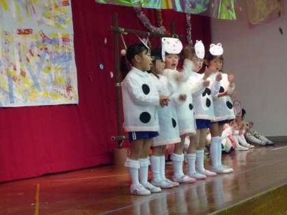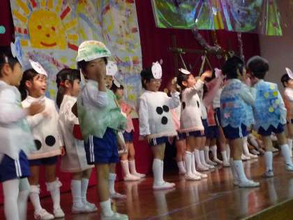 衣装やお面、全て手作り。日頃の手遊びや、ゴム遊びなど自信をもって披露していました。