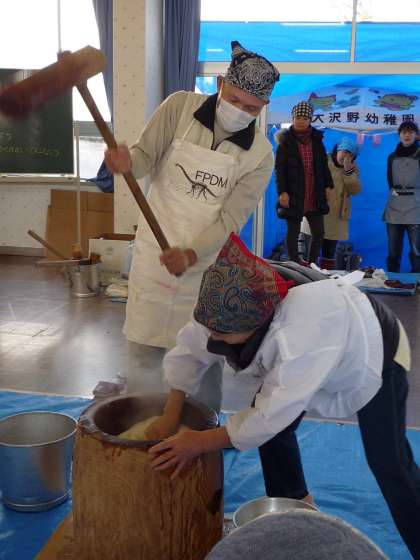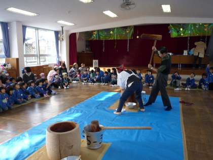 地域の方々や消防のお兄ちゃん、おじいちゃんやおばあちゃん、そしてお母さん方の協力をいただきおもちつきが始まりました。