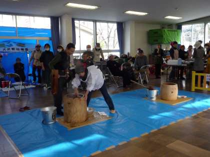 朝からの雪景色にびっくり。今日のおもちつきをより印象的にしてくれました。