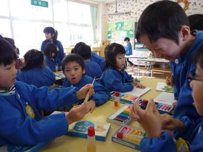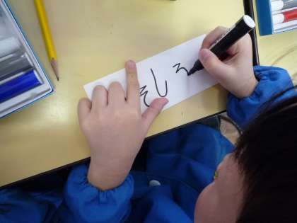 「どんな名前にしようか」「スパゲッティ」「ラーメン」・・・ふと見ると・・・なんと「味噌汁グループ」がありました。「ねえ、どうやって決めたの」「なんか、毎日でてくるじゃん」「とうふとか」「わかめとか」・・・なんと素敵な日本人の子ども達なんでしょう。「最高のクループだね。外国に行くと”みそスープ”ってよろこんでもらえるよ」と話すと、ご機嫌な子ども達でした。その”そ”がうまく書けなくて、何度も書き直しながら「まず”て”を書いて見よう」と試行錯誤していたり、「じゃ私かいてあげる」「ぼく、簡単な”し”にする」「じゃ、僕は”る”にするね」と自分たちができることを協力したりしながらしている姿にも感心しました。