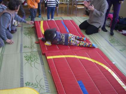 そこで今度は、マットを縦につないでおいもごろごろ。すっかりみんな仲良しになりました。