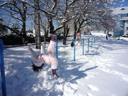 雪の中の鉄棒に挑戦するお友達。