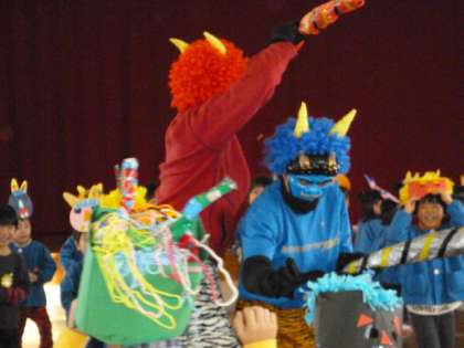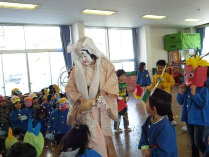 みんなが、豆まきをしていると・・・なんとそこに青鬼と赤鬼がやって来て、子どもたちはびっくり。みんなで力を合わせて、二人の鬼を追い出しました。
