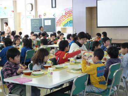 初めて入るランチルーム。小学生の給食の準備の仕方や牛乳パックやパンの袋の片付け方など、幼稚園とは違うところがたくさんありました。