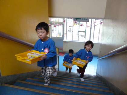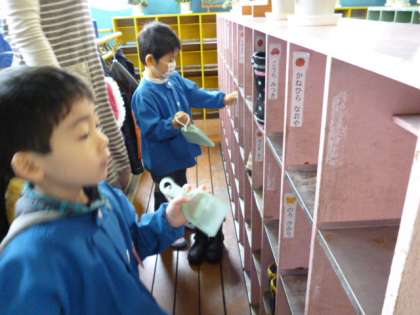 4歳児さんは、早速今まで使った場所の掃除をし、2階の階段をわくわくして登り、新しい5歳児さんの部屋に道具箱を引っ越しました。