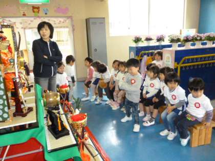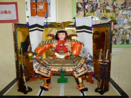 幼稚園の玄関にお目見えした五月人形。