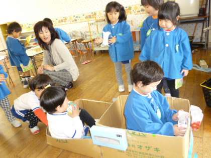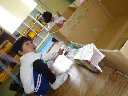 「段ボールってセロテープより、ガムテープの方が取れなくていいよ」「ここスイッチ押したら電気つくんだよ」などみんなで乗れる電車を工夫しながら作っていた4歳児さんたちでした。