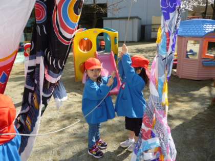 みんなで幼稚園のお庭にこいのぼりをあげました。