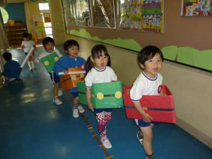 3歳児さんが、かわいい電車に乗って幼稚園のあちらこちらをお散歩。