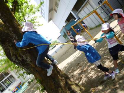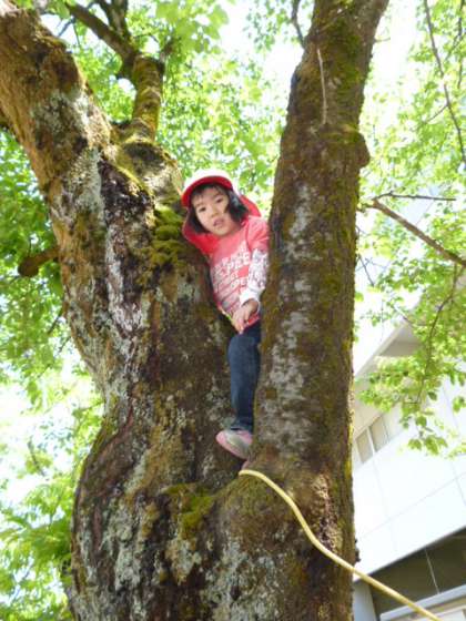 今日は、緑がいっぱいの桜の木登りに挑戦。