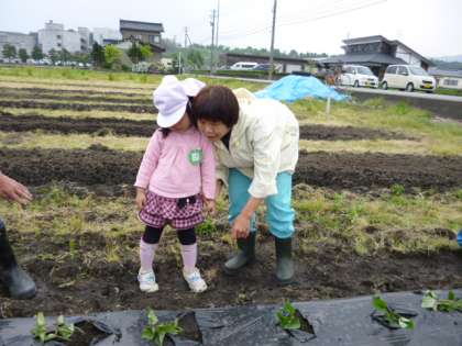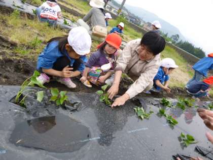 子どもたちのおばあちゃんが丁寧にいも苗の植え方を教えてくださいました。