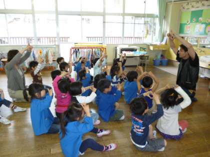 5歳児はもうお友達になっていますが、3歳児さんは、「この人いったいだーれ」という表情で、じっと見入っていました。
