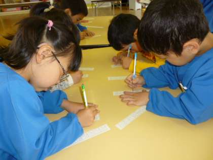 5歳児さんは、じっくり机に向かってお勉強。よい姿勢になっているかな?正しい鉛筆の持ち方をしているかな?正しい書き順になっているかな?など気をつけながら真剣に取り組んでいました。