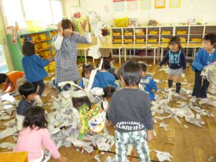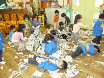 新聞紙をいっぱいいっぱいちぎったり投げたり、お布団にしてかくれんぼをしたり・・・