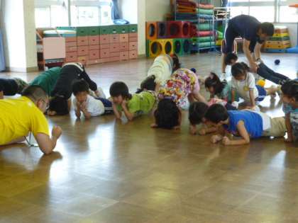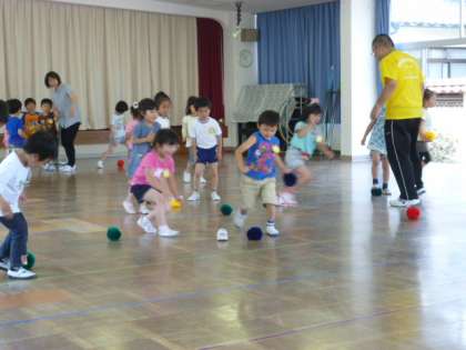 今は、まだうまくいきませんが、この遊びを繰り返すなかで、少しずつ友達とボールをまわす大切さが、わかってくるように思います。