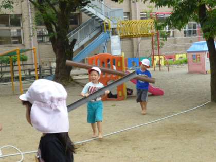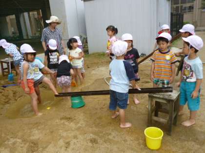 昨年の大きいくみさんがしていた泥団子つくりや裸足の泥遊びが大人気。