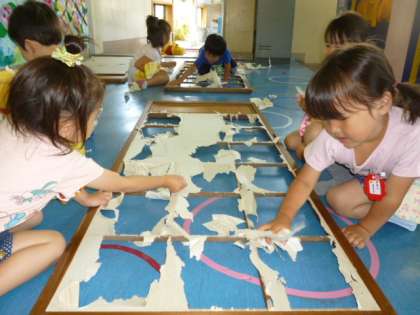 「面白いね」「楽しいね」と言いながら障子紙を破いている子ども達を「なんか楽しそう。でも家でされた大変」と通りがかったお母さん達はうれしいやら心配やら・・・