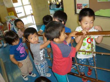 キレイに破いた障子戸をみんなで運び「ひまわりさん、お願いします」と4歳児さんに次のお仕事をお願いしていた3歳児さんでした。