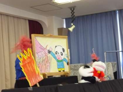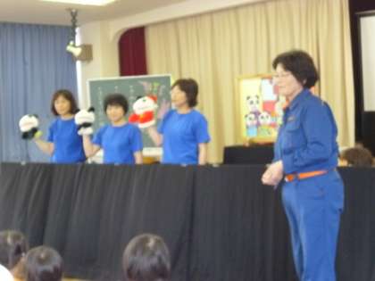 女性消防団の方々が、指人形を使って火遊びの危険を教えてくださいました。
