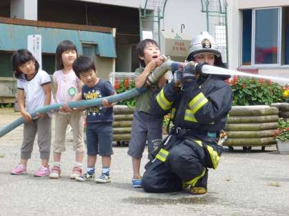 子ども達は消防士のお兄さんと一緒に、放水体験をしました。