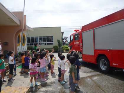 「重いね」「すごいね」「消防車の中にいろいろな機会が入っているんだ」など興味を持ってみていました。