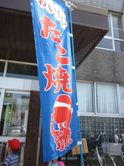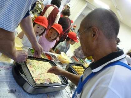 子ども達は、早速見学に。「かわいいの」「一緒に食べて行かれ」など楽しく会話しながら、熱々のたこ焼きをいただいてきました。