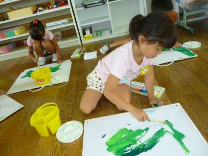 自分の好きな色を選び思いっきり画用紙いっぱいに色を伸ばしていきます。「えっ、いいが・・・」といいながらも、絵の具の感触を楽しんでいました。