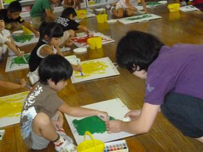 「きちんと描かなきゃ」と思いなかなか取り組めないお友達や「えっ、楽しい。おこのみやきみたい」と、にこにこと楽しんでいたお友達。「僕、真っ黒になった」と自分の絵を失敗したと感じていたお友達など、いろいろでしたが、先生は、「是非親子で美術館に出向き、いろいろなタッチの絵があることやそれぞれの絵の素晴らしさなどを感じてもらえたら自信がつくんじゃないかな・・・」と話しておられました。