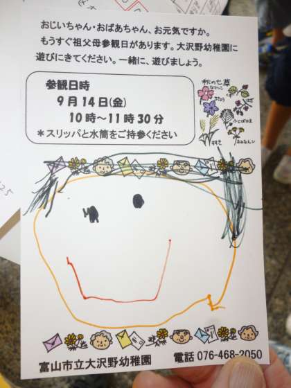 敬老の日に向けて祖父母参観を企画し、遠くにいて来られないおじいちゃんやおばあちゃん、そして一緒に暮らしているおじいちゃんやおばあちゃんにも葉書を書き、近くのポストに入れに行きました。