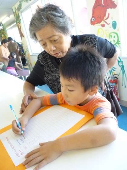 5歳児さんは、おばあちゃん達と幼稚園の中の動物探検に出かけました。「これライオン」「テントウ虫も2匹いるんだよ」と、見つけた動物や昆虫をおばあちゃん達に教える姿や「カタカナかけるの?」と、字を優しく教えてもらったりしている穏やかな触れ合いが見られました。